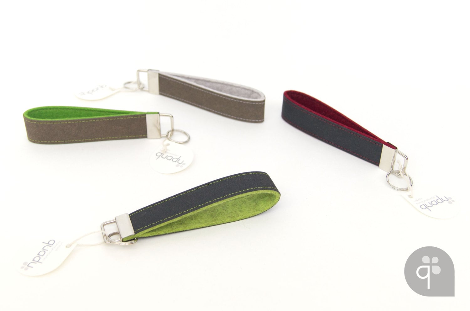 These stylish keychains (band width 25 mm) are made of 2 mm thick 100% wool felt on the inside and SnapPap on the outside.