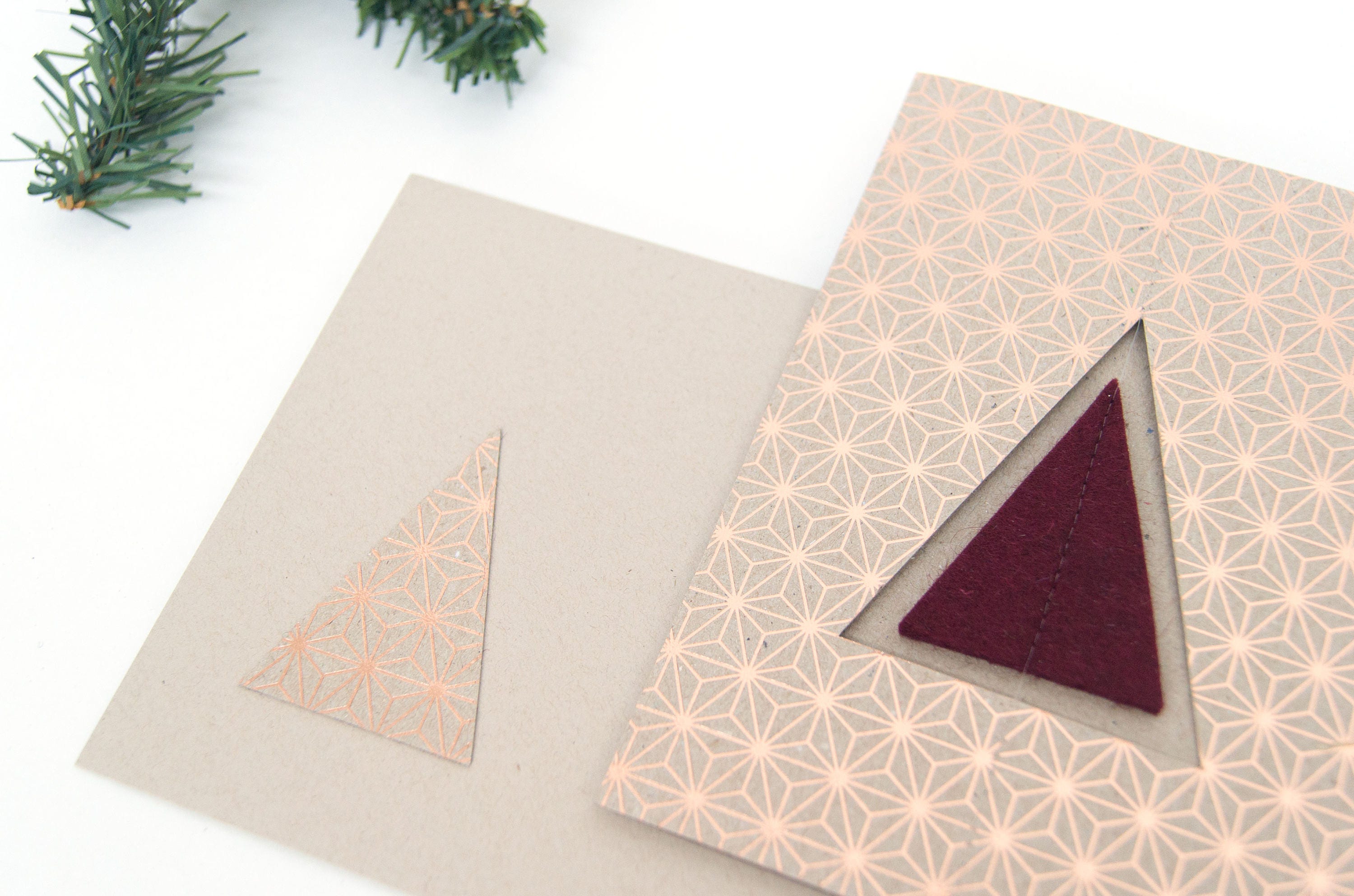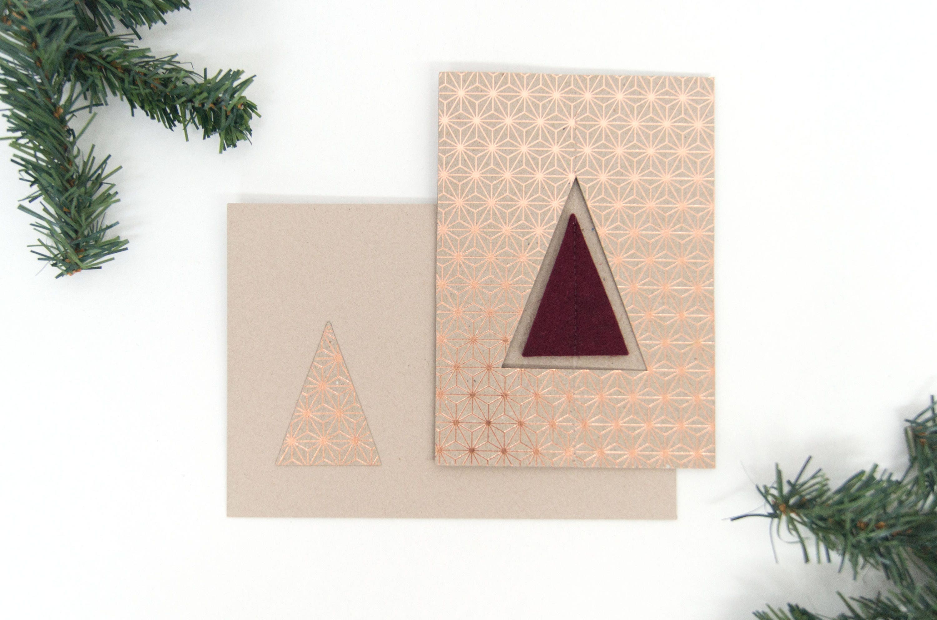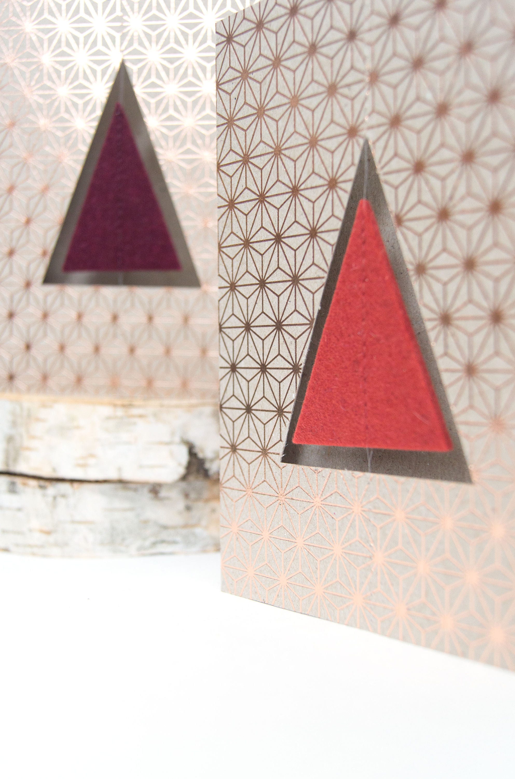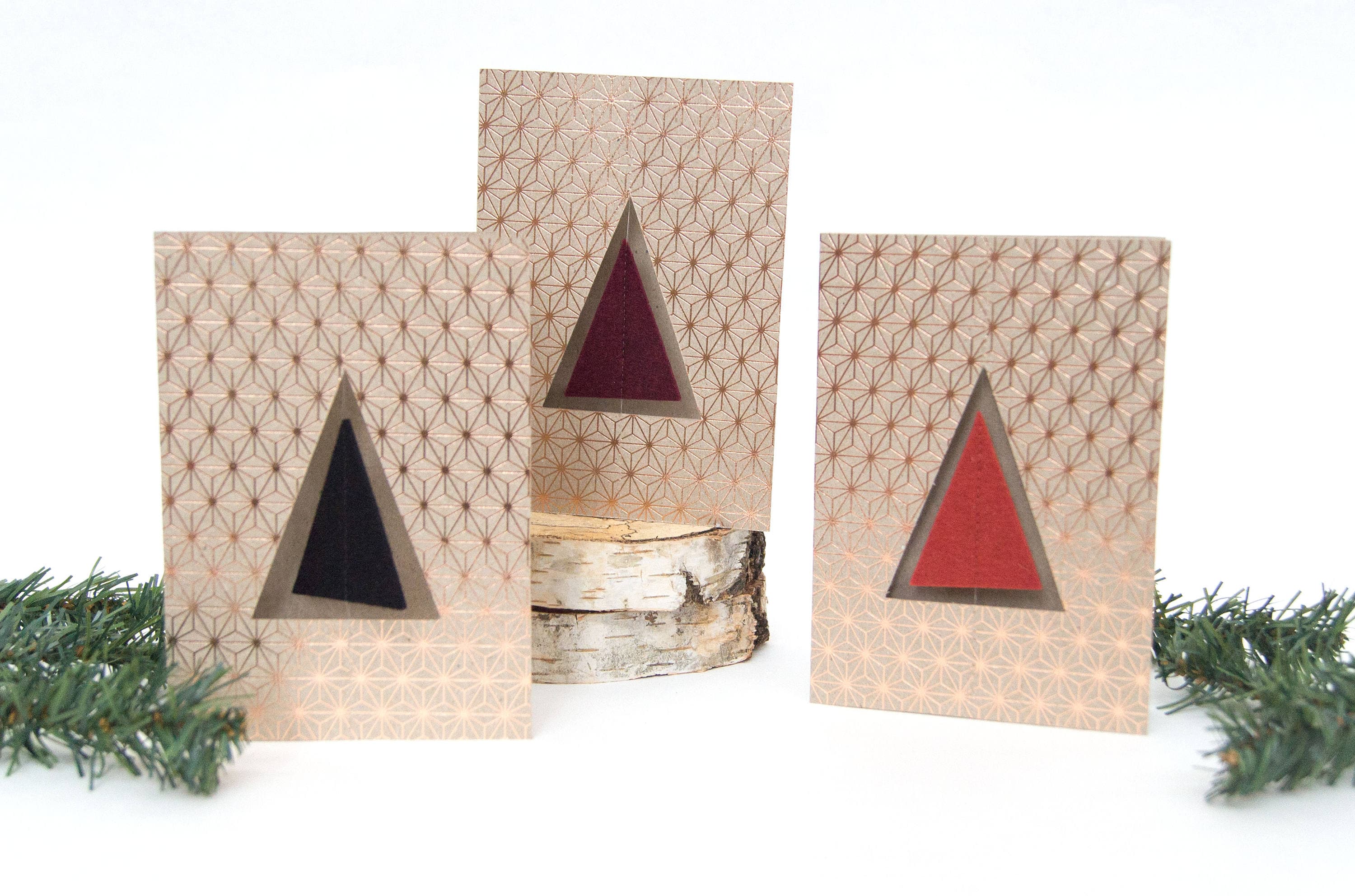 Handmade Christmas card made from printed 100% recycled cardboard with a stylized tree made from 100% wool felt.