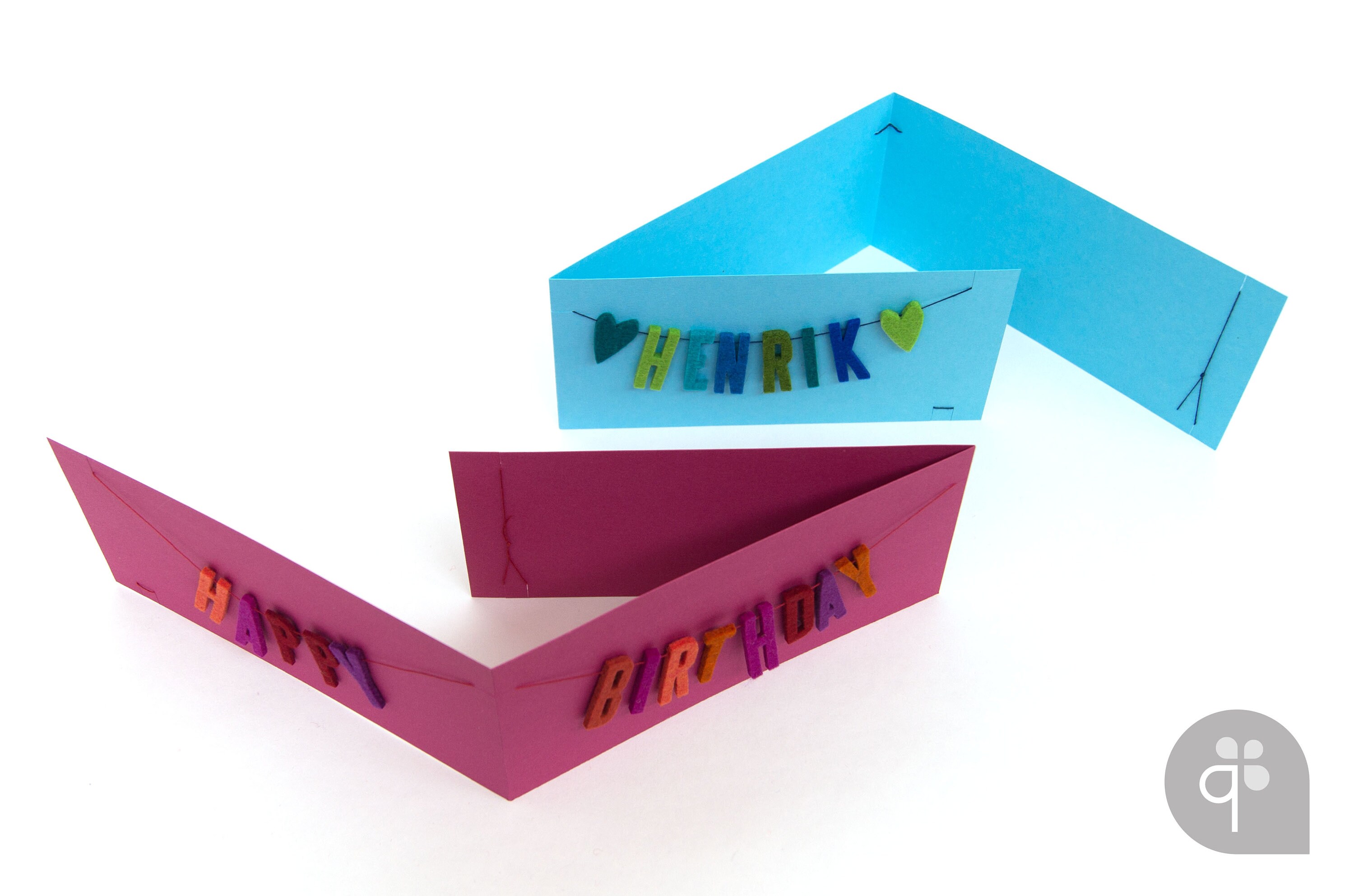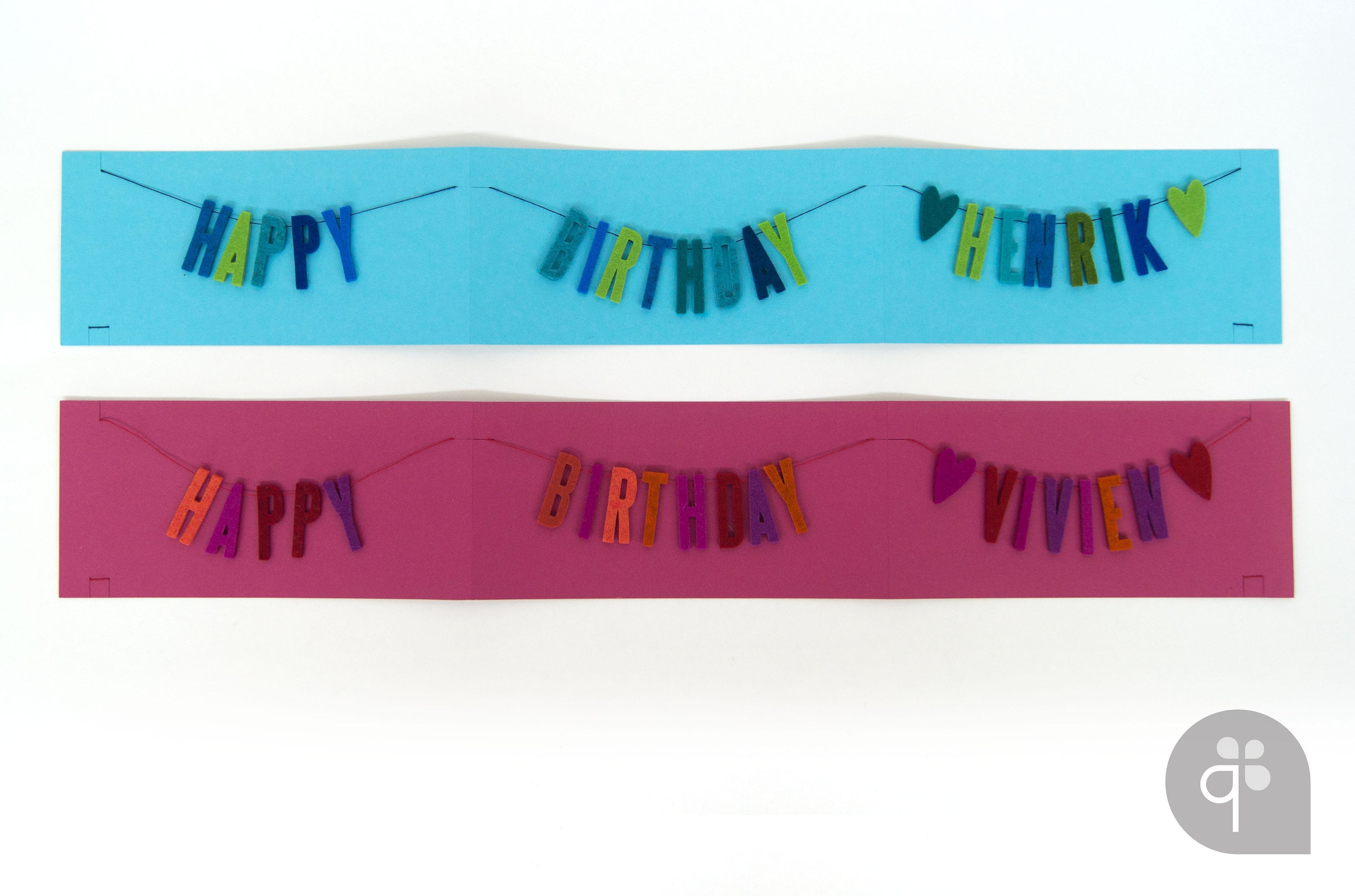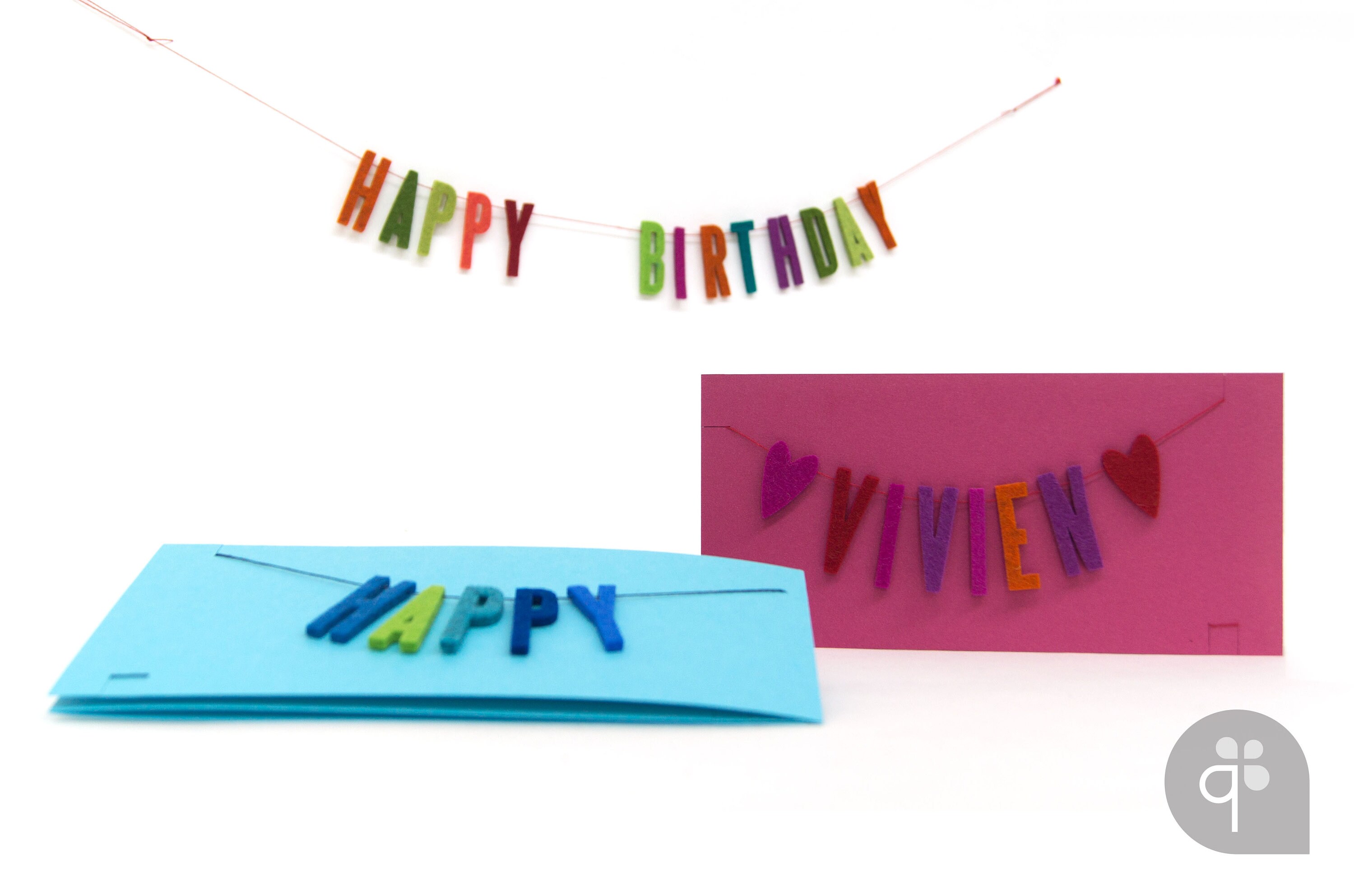 The "HAPPY BIRTHDAY" garland with individual name was punched out of 100% wool felt and threaded on a sturdy thread. The arrangement of colored letters varies from card to card, so each card is unique.