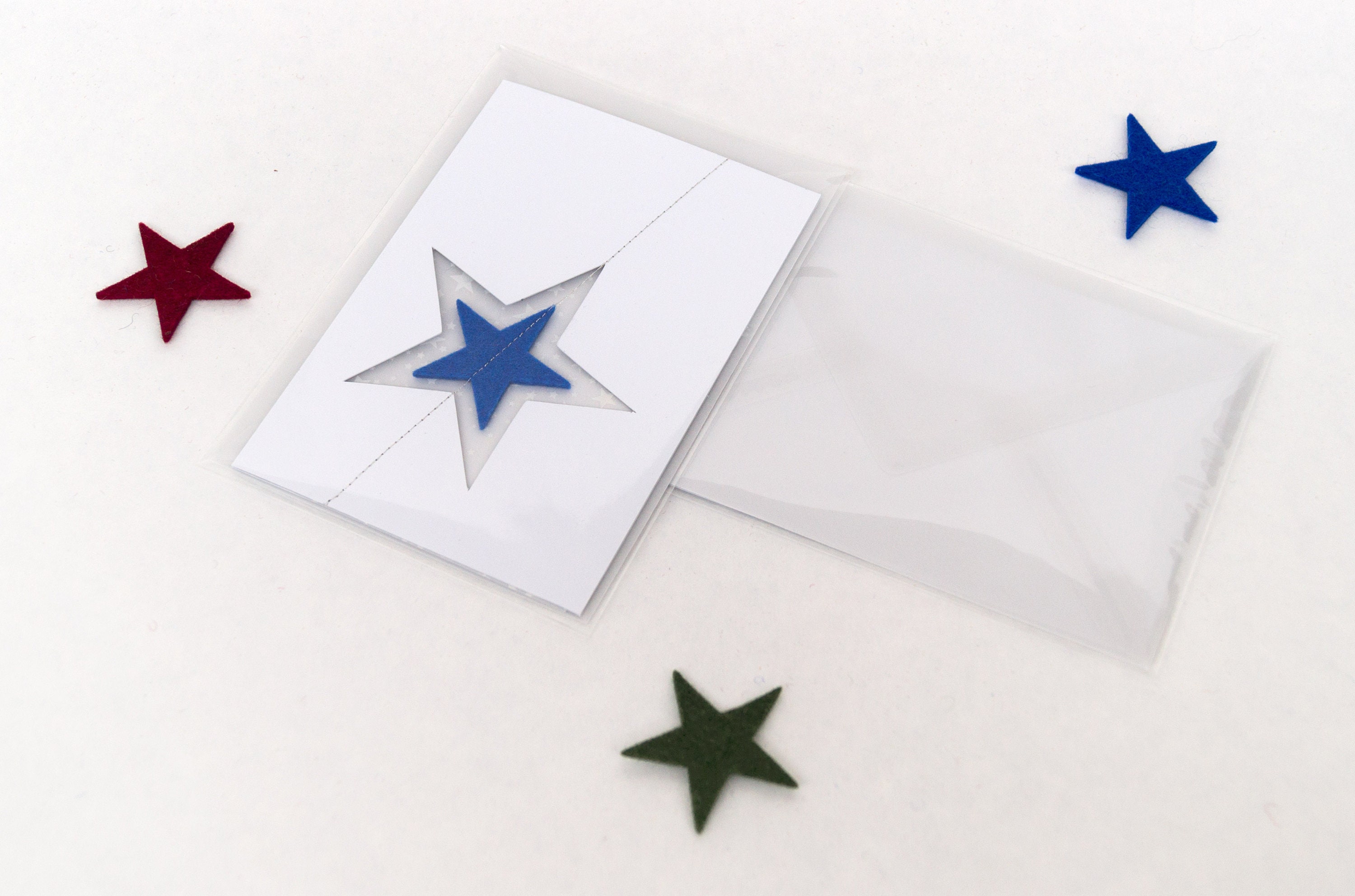 Handmade Christmas card with a punched-out star made of 100% wool felt and transparent insert paper with a star motif for your personal text.