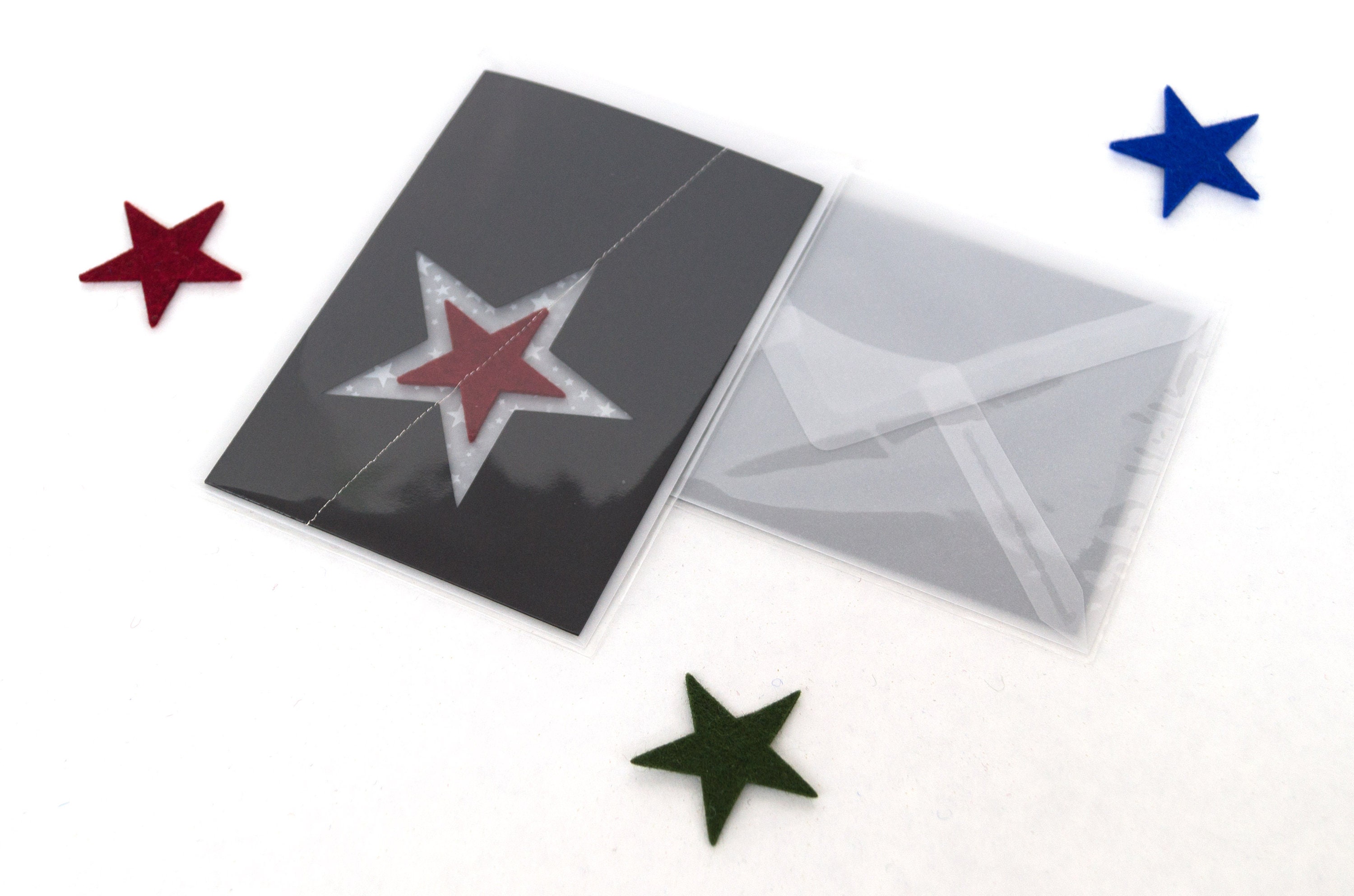 Handmade Christmas card with a punched-out star made of 100% wool felt and transparent insert paper with a star motif for your personal text.